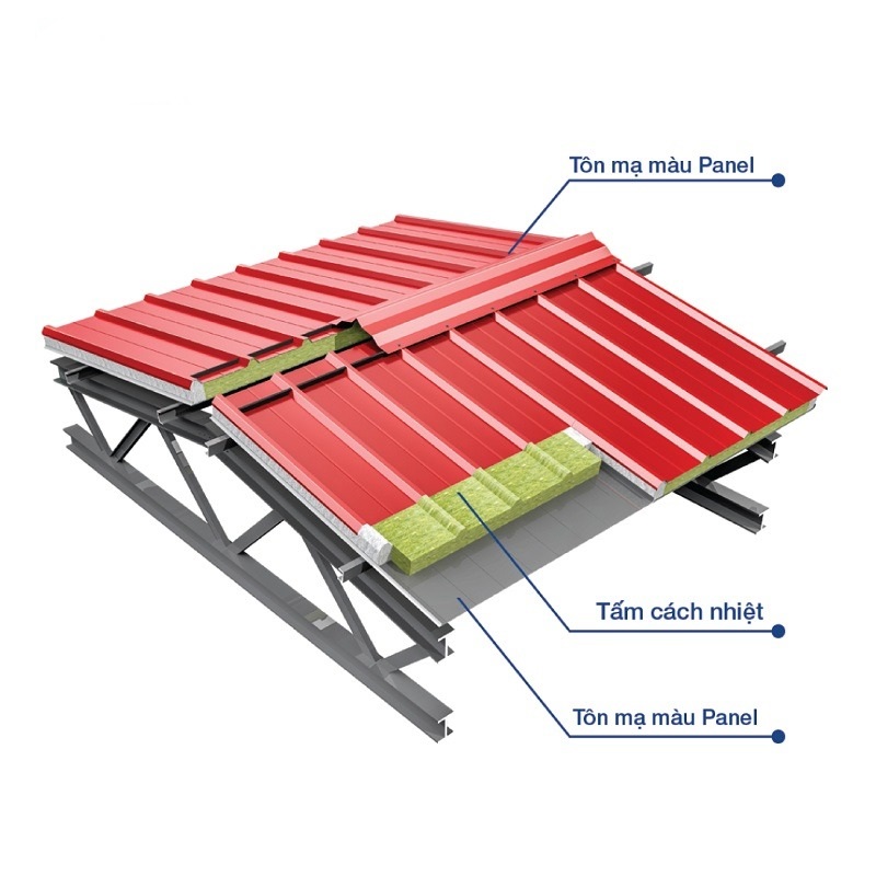 - Lớp bề mặt: Thường là tôn mạ kẽm hoặc tôn mạ màu cao cấp, được sơn tĩnh điện để tăng tính thẩm mỹ và độ bền.